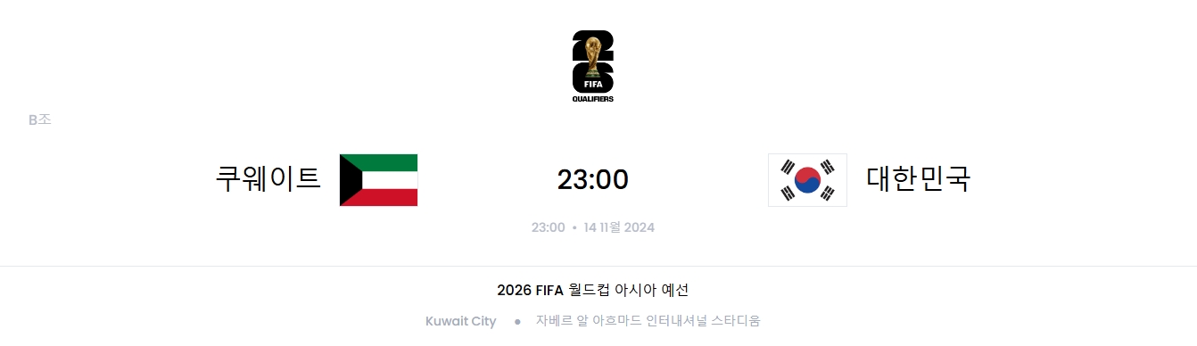 한국과 쿠웨이트의 경기는 2024년 11월 14일 오후 11시에 자베르 알 아흐메드 국제경기장에서 열립니다. 이 경기는 SBS를 통해 생중계될 예정이며, OTT 채널인 쿠팡플레이에서도 시청할 수 있습니다.