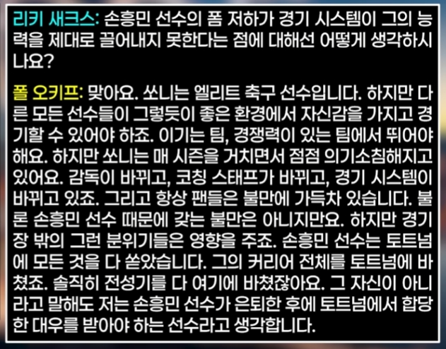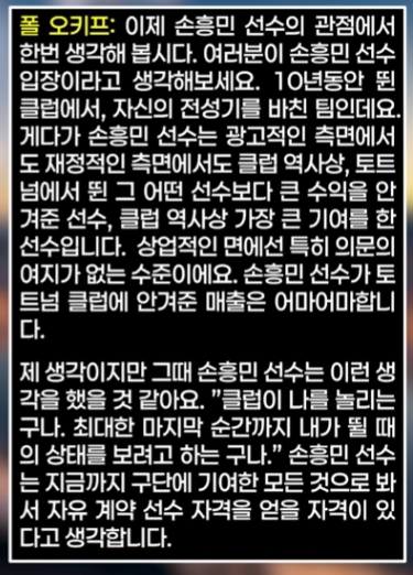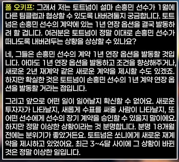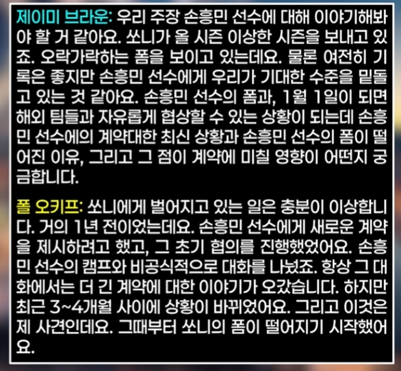 그리고 더 중요한 사실은 2025년 1월부터 손흥민 선수는 FA 자유계약 신분 자격을 획득하게 되었습니다. 우리는 이점에 주목해야 합니다. 벌써 영국 언론들과 애이전트들은 한층 더 높아진 이적 가능성과 수많은 구단들과 연결성에 주목하고 있습니다. 토트넘 1티어 에이전트인 폴 오키프 또한 생생하게 손흥민 선수에 대해 생각을 밝혔는데요. 앞으로 어떻게 흘러갈지 굉장히 궁금합니다.