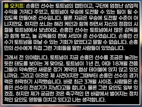그리고 더 중요한 사실은 2025년 1월부터 손흥민 선수는 FA 자유계약 신분 자격을 획득하게 되었습니다. 우리는 이점에 주목해야 합니다. 벌써 영국 언론들과 애이전트들은 한층 더 높아진 이적 가능성과 수많은 구단들과 연결성에 주목하고 있습니다. 토트넘 1티어 에이전트인 폴 오키프 또한 생생하게 손흥민 선수에 대해 생각을 밝혔는데요. 앞으로 어떻게 흘러갈지 굉장히 궁금합니다.