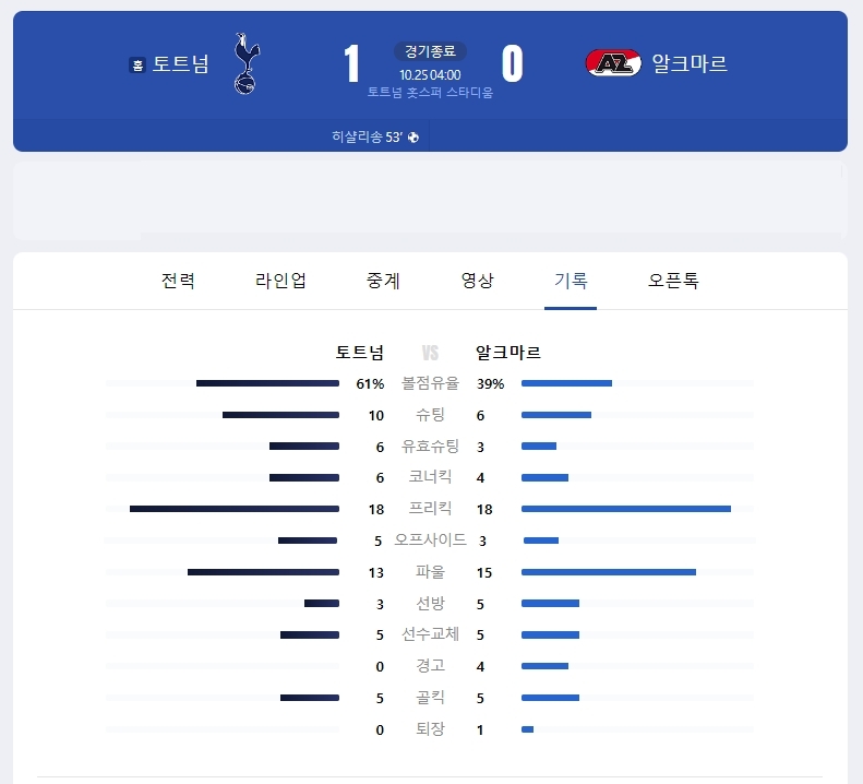 이번 경기에서 토트넘은 AZ 알크마르를 상대로 1-0으로 승리했습니다. 히샬리송의 페널티킥 골이 결정적인 순간이었으며, 팀은 수비에서도 안정적인 모습을 보였습니다. 경기 후반에는 상대팀의 공격을 잘 막아내며 승리를 지켰습니다. 이로 인해 토트넘은 유럽 대회에서의 순위를 더욱 확고히 할 수 있었습니다.