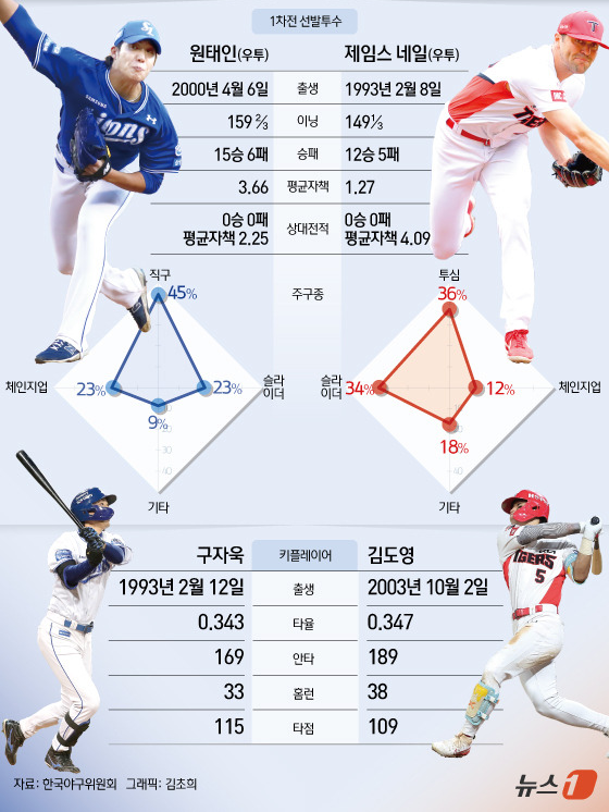 KIA 타이거즈 외국인 투수 제임스 네일과 삼성 라이온즈 토종 에이스 원태인이 한국시리즈(KS·7전 4승제) 1차전에서 선발 맞대결을 펼친다. KIA와 삼성은 21일 광주 기아챔피언스필드에서 2024 신한