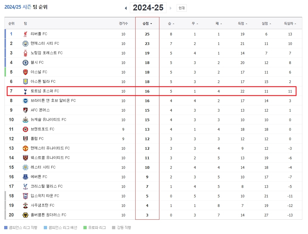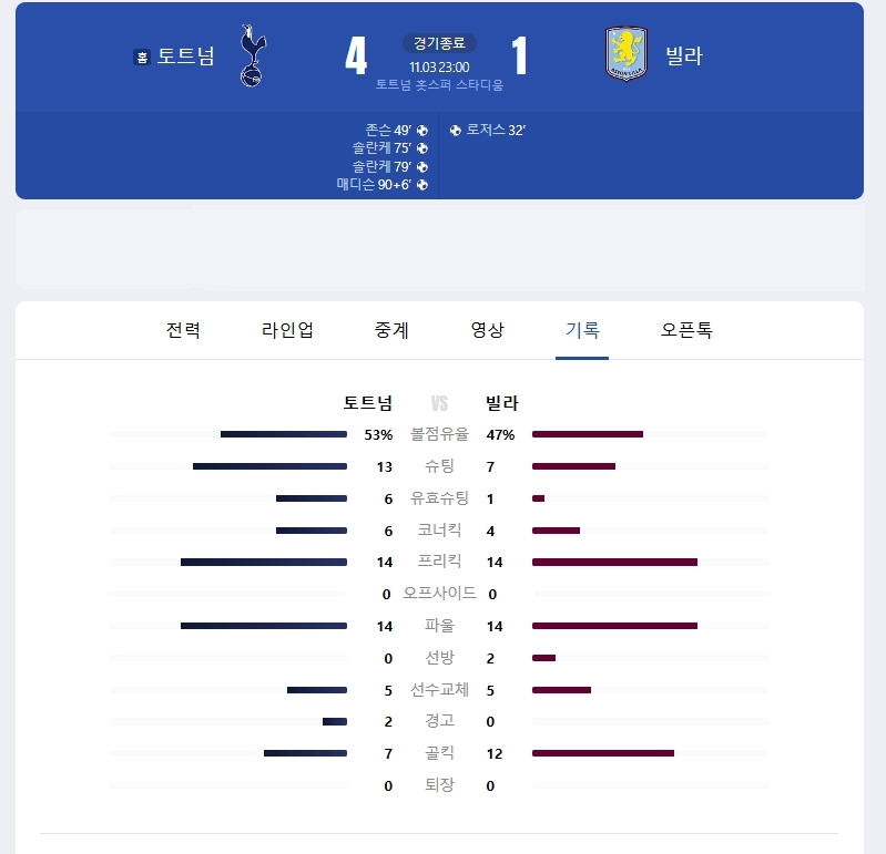 이날 승리로 토트넘은 5승 1무 4패, 승점 16점을 기록하며 리그 순위를 7위로 끌어올렸습니다. 아스톤 빌라는 5승 3무 2패, 승점 18점으로 6위에 머물렀습니다.