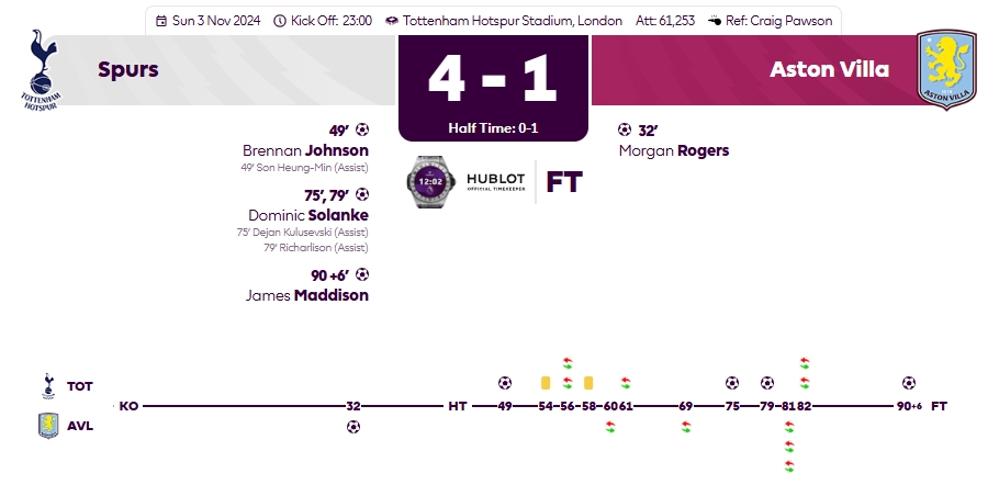 지난 3일(한국시간) 토트넘 홋스퍼 스타디움에서 열린 아스톤 빌라와의 2024-2025 잉글리시 프리미어리그(EPL) 10라운드 홈 경기에서 토트넘이 4-1 역전승을 거두었는데요, 이 경기에서 손흥민 선수는 선발 출전하여 56분 동안 그라운드를 누비며 팀의 승리에 큰 기여를 했습니다. 👍